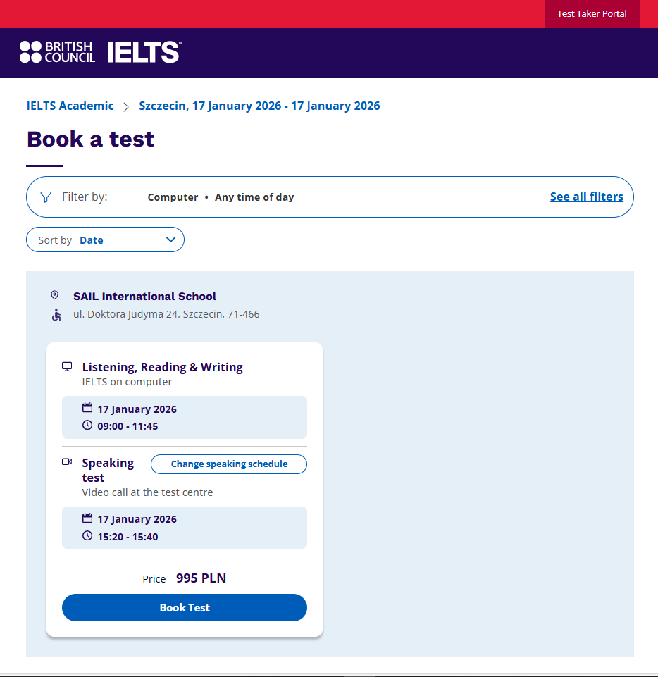 Whether learners aim to study abroad, build an international career, or open global mobility pathways, IELTS serves as the golden standard of English proficiency assessment. With daily immersion in English and a strong international learning environment, SAIL provides an ideal setting to prepare for the test and demonstrate language skills with confidence. Tests are conducted at our campus at ul. Doktora Judyma 24 in Szczecin.