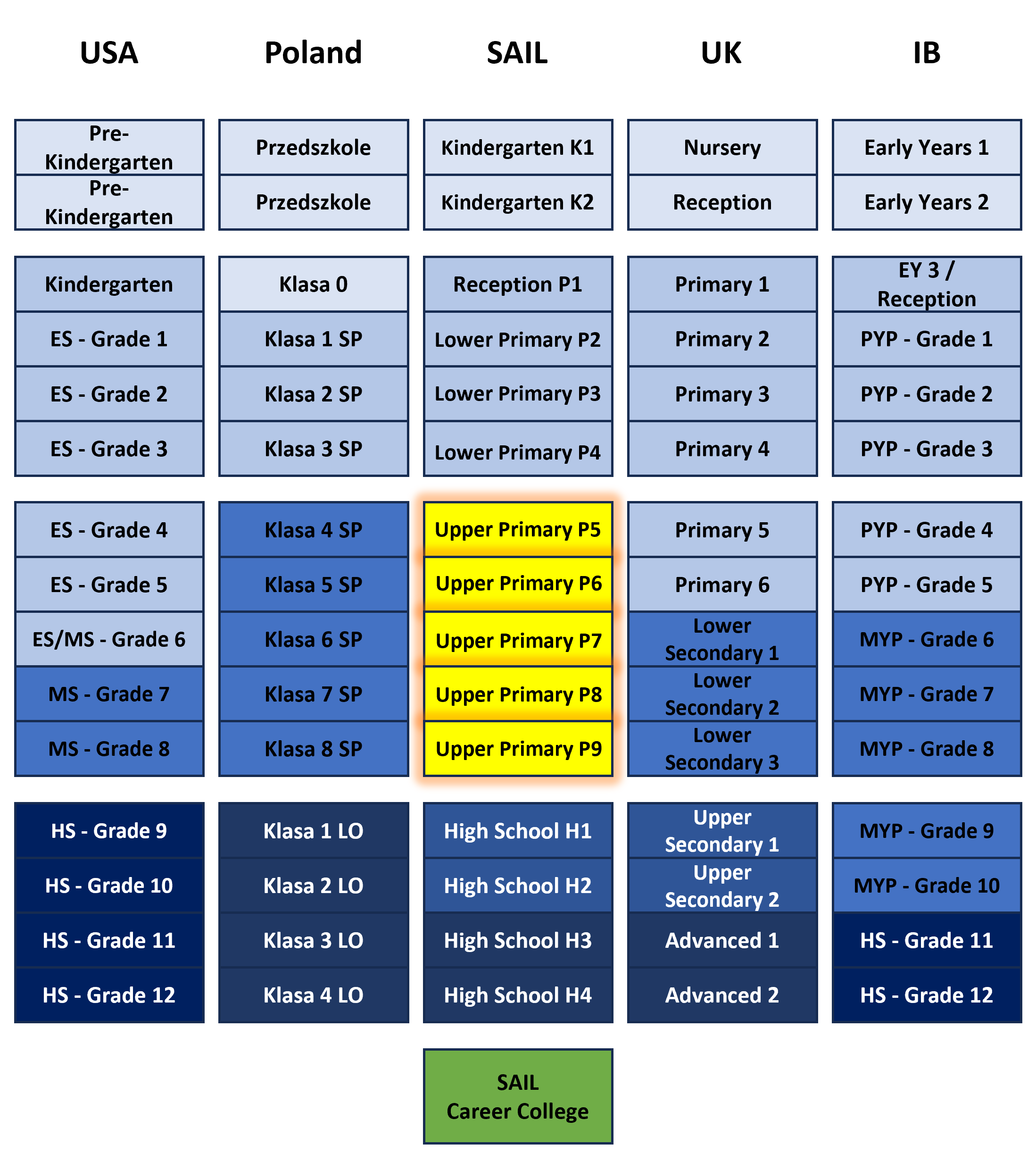 At the end of each semester, families receive a detailed semester report with teacher comments for every subject, providing a comprehensive view of each child’s progress. The Upper Primary stage concludes with the national Egzamin ósmoklasisty (Grade 8 exam), which is primarily relevant for Polish-speaking pupils wishing to continue within the Polish education system. Progression to SAIL High School is independent of this exam.